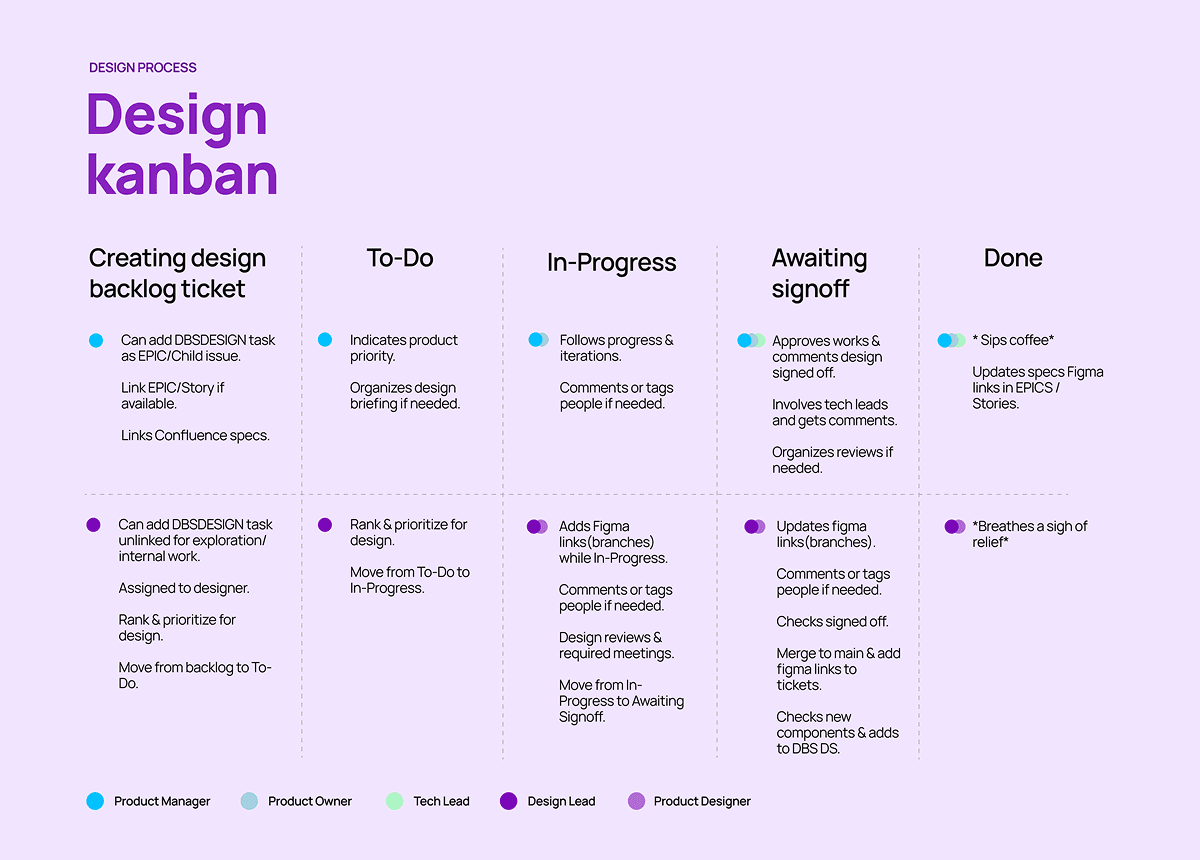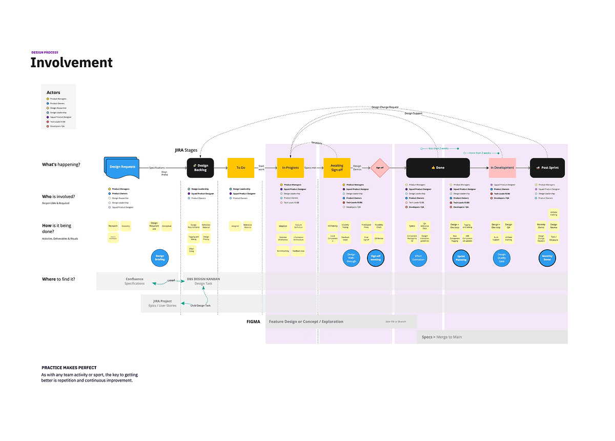 Set up a clear Design Intake process→ so teams could prioritise work properly and understand what design would deliverImproved cross-team collaboration→ via a bespoke Ways of Working rolled out across all squads, capturing everything from Design Kanban through structured Figma review ritualsBuilt a lean Design-at-Scale framework→ to speed up delivery across multiple squadsIntroduced DesignOps governance→ to optimise tools, reduce costs, and standardize design and development workflowsEstablished a federated Product Design System→ tied to coded components to ensure consistency and reusable UI patternsIntegrated usability testing and OKRs→ into the design process to measure impact and improve decision-makingMentored and developed the team→ through skill assessments and individual growth plans